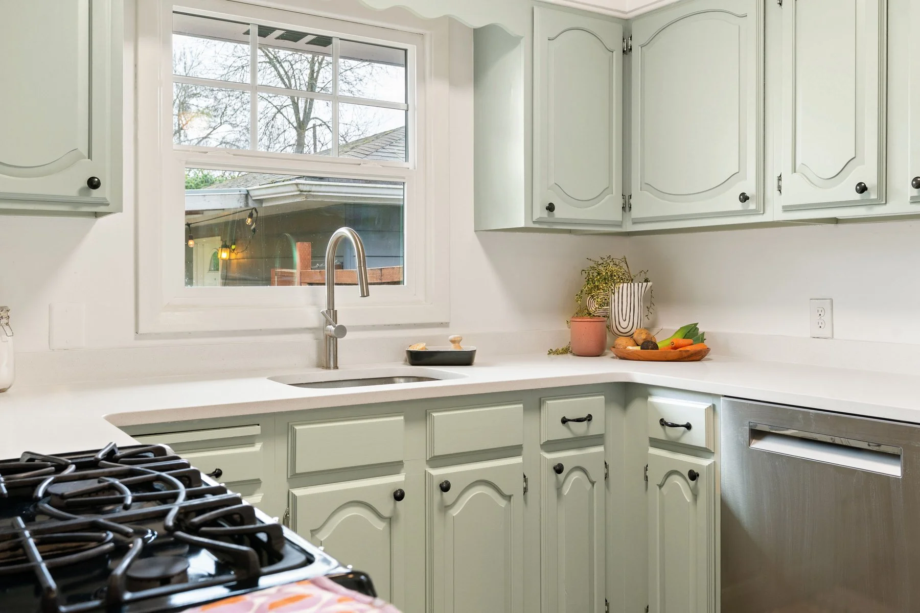 The kitchen features stainless steel appliances and has been refreshed with quartz countertops, an undermount sink, a pull-down spray faucet, refinished cabinetry, and new fixture to create a clean, modern space that’s both functional and inviting.