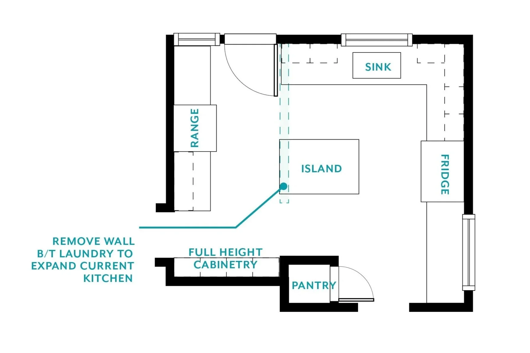 Dreaming of a luxury kitchen? While the current kitchen is solid, the main level floor plan makes expansion possible without sacrificing key living spaces. This plan diagram shows one potential future layout. Removing the wall separating the laundry would create 200+ SqFt of kitchen area for abundant countertops and storage. Laundry can be relocated or seamlessly integrated within cabinetry to conceal a stackable unit. Dream away, my friend!